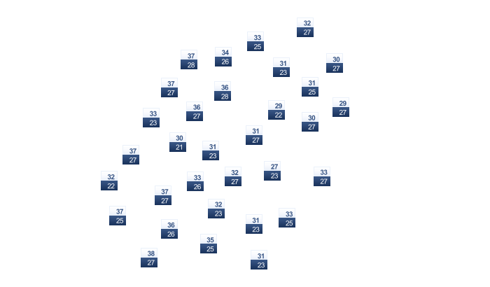 | 29 | 29 | 30 | 32 | 35 | 39 | 42 | 41 | 37 | 33 | 31 | 29 |