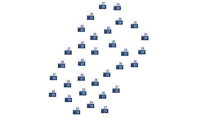 | 22 | 23 | 24 | 25 | 27 | 29 | 31 | 31 | 29 | 26 | 23 | 22 |