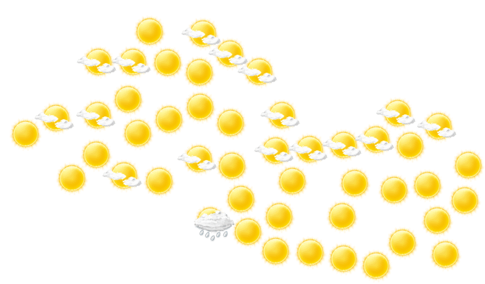 In Santa Ana gibt es am Morgen ungestörten Sonnenschein bei Werten von 18°C. Mittags bilden sich vereinzelt Wolken bei Höchstwerten von 35°C. Abends ist es in Santa Ana wolkenlos bei Temperaturen von 22 bis 23°C. In der Nacht gibt es keine Wolken und die Sterne sind klar zu erkennen bei Werten von 19°C.