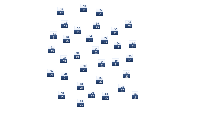 | 31 | 32 | 32 | 32 | 31 | 29 | 28 | 27 | 28 | 29 | 31 | 31 |