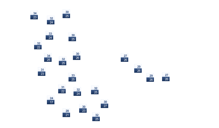 | 23 | 24 | 25 | 26 | 26 | 26 | 22 | 22 | 23 | 22 | 22 | 22 |