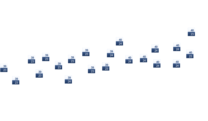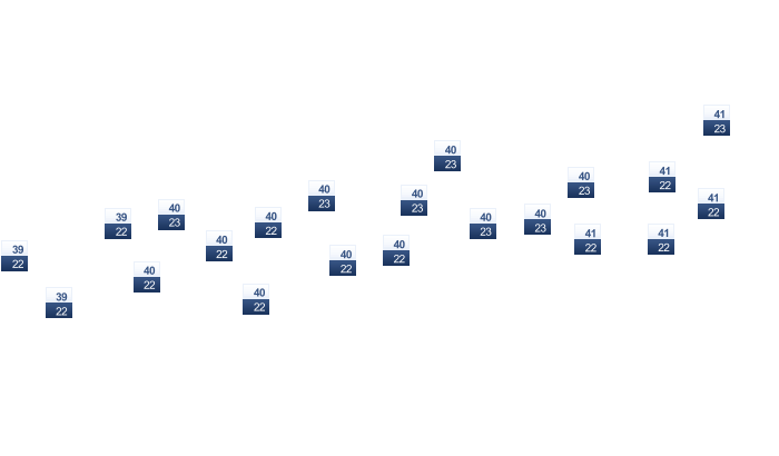 | 15 | 16 | 17 | 18 | 20 | 23 | 23 | 23 | 23 | 22 | 19 | 16 |