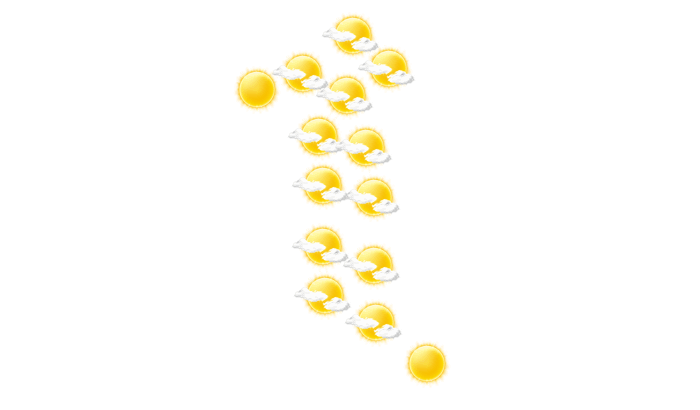 In Hohoe strahlt am Morgen die Sonne und die Temperatur liegt bei 24°C. Im Laufe des Mittags regnet es und die Temperaturen erreichen 34°C. Am Abend stören in Hohoe nur einzelne Wolken den sonst blauen Himmel bei Temperaturen von 25 bis 26°C. Nachts ist es überwiegend klar mit vereinzelten Wolken bei einer Temperatur von 24°C.