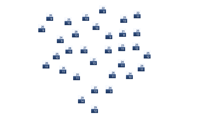 | 23 | 25 | 27 | 28 | 29 | 27 | 26 | 26 | 26 | 24 | 23 | 22 |
