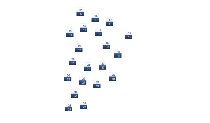 | 23 | 25 | 27 | 28 | 29 | 27 | 26 | 26 | 26 | 24 | 23 | 22 |
