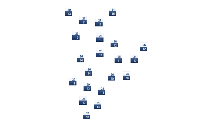 | 23 | 25 | 27 | 28 | 29 | 27 | 26 | 26 | 26 | 24 | 23 | 22 |
