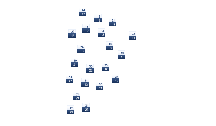 | 23 | 25 | 27 | 28 | 29 | 27 | 26 | 26 | 26 | 24 | 23 | 22 |