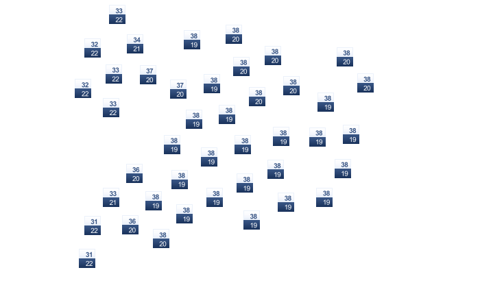| 18 | 19 | 20 | 21 | 22 | 23 | 23 | 23 | 23 | 23 | 22 | 19 |