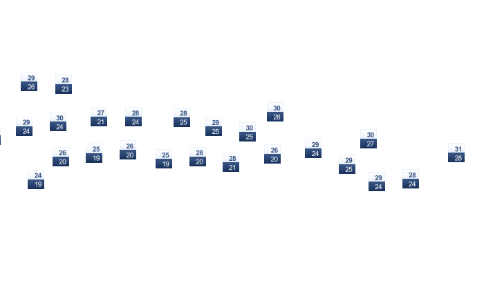Temperatur Höchstwerte °C | 31 | 31 | 32 | 33 | 33 | 35 | 35 | 35 | 34 | 33 | 32 | 31 |