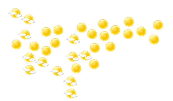 In Yoro wird am Morgen die Sonne von einzelnen Wolken verdeckt bei Werten von 14°C. Später ist es sonnig und die Temperatur steigt auf 28°C. Abends gibt es in Yoro nur selten Lücken in der Wolkendecke bei Temperaturen von 16 bis 18°C. Nachts bilden sich vereinzelt Wolken bei Tiefstwerten von 15°C.