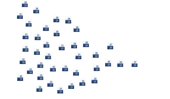 | Temperatur Tiefstwerte °C | 23 | 23 | 24 | 25 | 24 | 23 | 24 | 24 | 23 | 23 | 23 | 23 |