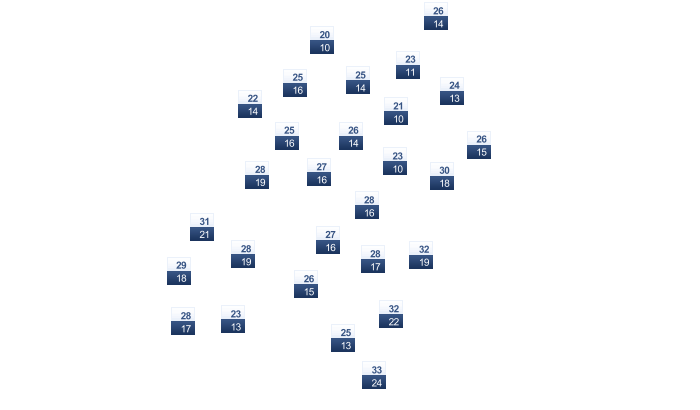 | 22 | 26 | 32 | 38 | 42 | 41 | 35 | 33 | 33 | 33 | 29 | 24 |