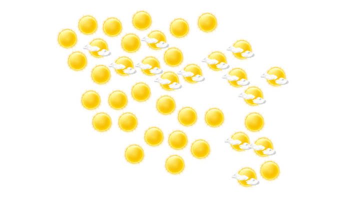 In Navsari stören morgens nur einzelne Wolken den sonst blauen Himmel bei Werten von 25°C. Im weiteren Tagesverlauf gibt es vom Nachmittag bis abends strahlenden Sonnenschein bei Werten von 26 bis zu 32°C. Nachts gibt es keine Wolken und die Sterne sind klar zu erkennen und das Thermometer fällt auf 24°C.