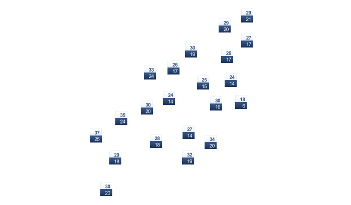| 22 | 26 | 32 | 38 | 42 | 41 | 35 | 33 | 33 | 33 | 29 | 24 |