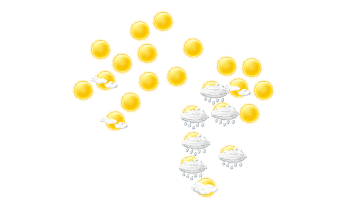 In Agar gibt es bis zum Nachmittag keine Wolken, die Sonne scheint bei Temperaturen von 20 bis 30°C. Abends ist es in Agar locker bewölkt bei Werten von 24 bis zu 26°C. Nachts gibt es keine Wolken und die Sterne sind klar zu erkennen bei einer Temperatur von 20°C.