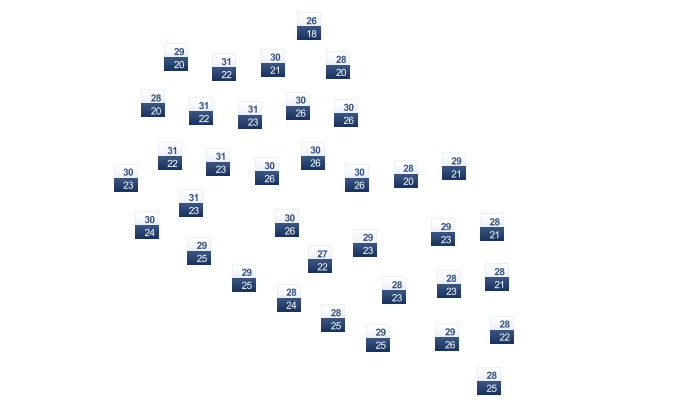 | 31 | 31 | 31 | 31 | 30 | 29 | 28 | 28 | 29 | 30 | 31 | 32 |