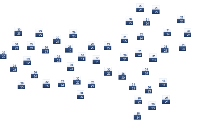 | 31 | 31 | 31 | 31 | 30 | 29 | 28 | 28 | 29 | 30 | 31 | 32 |