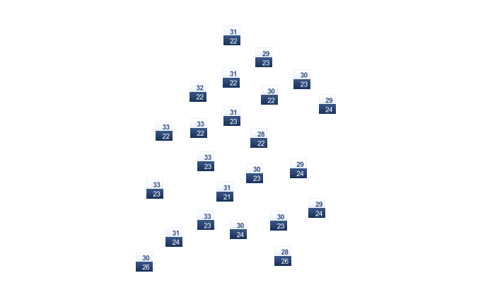 | 31 | 31 | 31 | 31 | 30 | 29 | 28 | 28 | 29 | 30 | 31 | 32 |