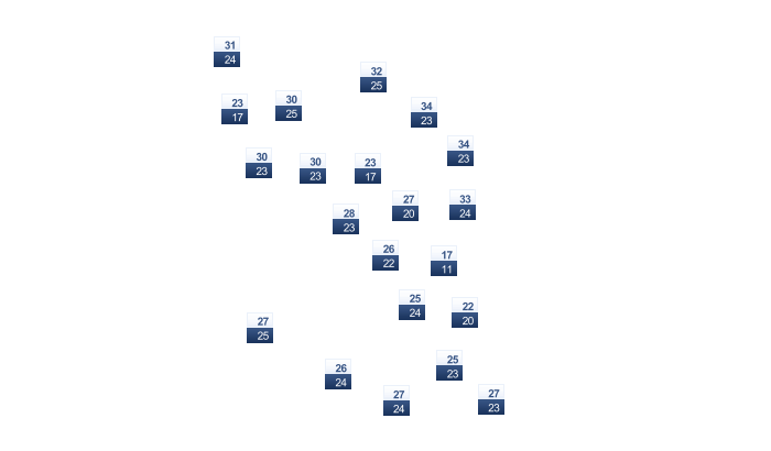 | 31 | 31 | 31 | 31 | 30 | 29 | 28 | 28 | 29 | 30 | 31 | 32 |