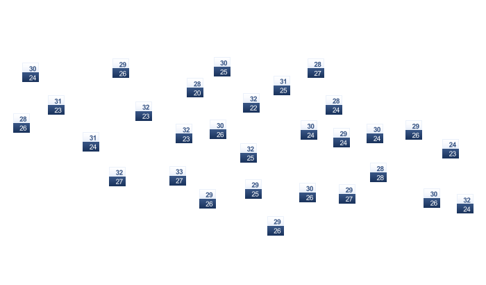 | 31 | 31 | 31 | 31 | 30 | 29 | 28 | 28 | 29 | 30 | 31 | 32 |