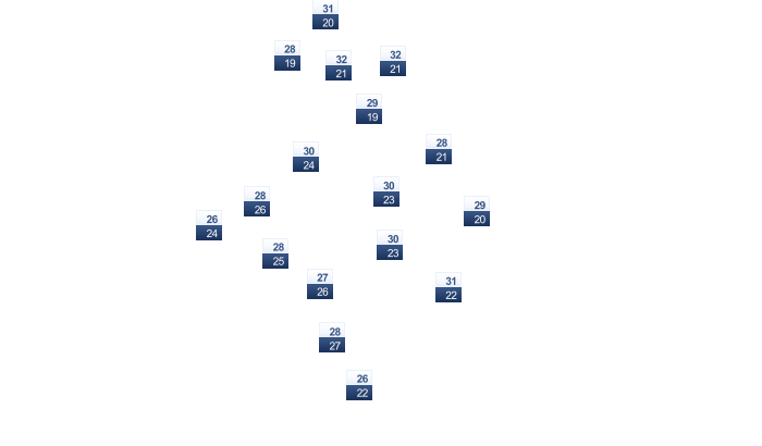 | 31 | 31 | 31 | 31 | 30 | 29 | 28 | 28 | 29 | 30 | 31 | 32 |