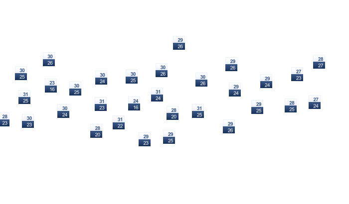 | 31 | 31 | 31 | 31 | 30 | 29 | 28 | 28 | 29 | 30 | 31 | 32 |