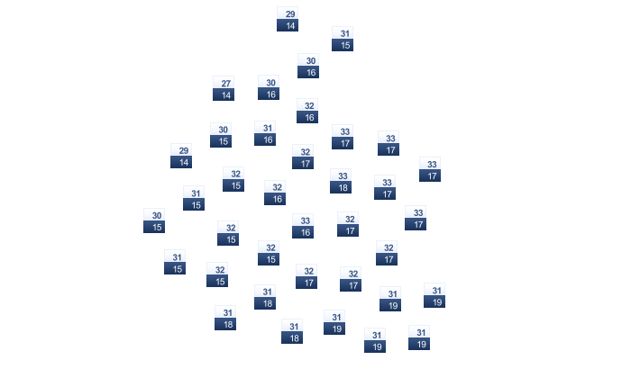 | 16 | 19 | 23 | 29 | 36 | 41 | 43 | 43 | 40 | 33 | 25 | 18 |