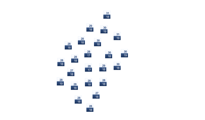 | 16 | 19 | 23 | 29 | 36 | 41 | 43 | 43 | 40 | 33 | 25 | 18 |