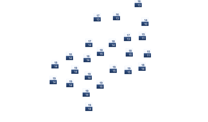 | 16 | 19 | 23 | 29 | 36 | 41 | 43 | 43 | 40 | 33 | 25 | 18 |