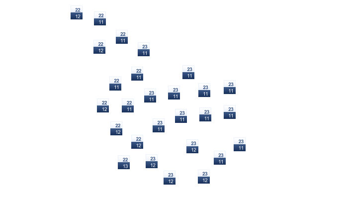 | 16 | 19 | 23 | 29 | 36 | 41 | 43 | 43 | 40 | 33 | 25 | 18 |