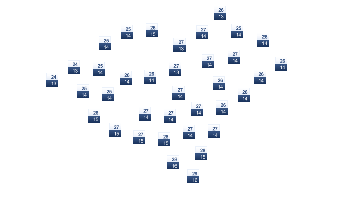 | 16 | 19 | 23 | 29 | 36 | 41 | 43 | 43 | 40 | 33 | 25 | 18 |