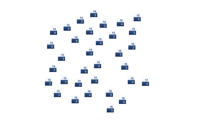 | 16 | 19 | 23 | 29 | 36 | 41 | 43 | 43 | 40 | 33 | 25 | 18 |