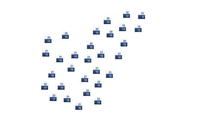 | 16 | 19 | 23 | 29 | 36 | 41 | 43 | 43 | 40 | 33 | 25 | 18 |