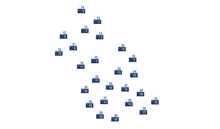 | 7 | 9 | 12 | 17 | 23 | 26 | 28 | 27 | 23 | 18 | 13 | 8 |