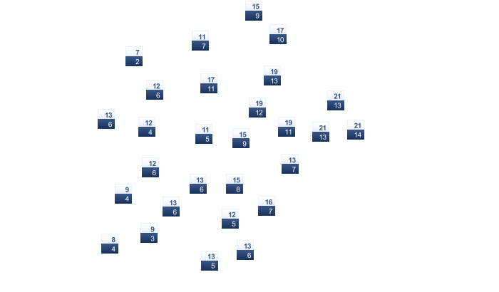 | 19 | 21 | 26 | 31 | 39 | 43 | 44 | 45 | 42 | 36 | 27 | 21 |