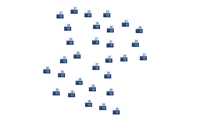19 | 21 | 26 | 31 | 39 | 43 | 44 | 45 | 42 | 36 | 27 | 21 |
