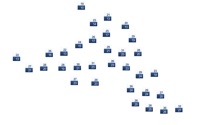 | 19 | 21 | 26 | 31 | 39 | 43 | 44 | 45 | 42 | 36 | 27 | 21 |