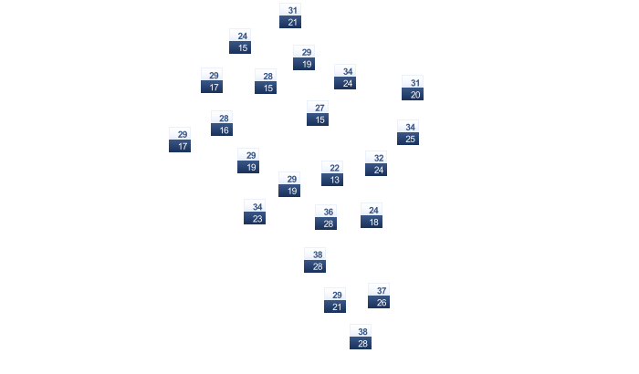 19 | 21 | 26 | 31 | 39 | 43 | 44 | 45 | 42 | 36 | 27 | 21 |