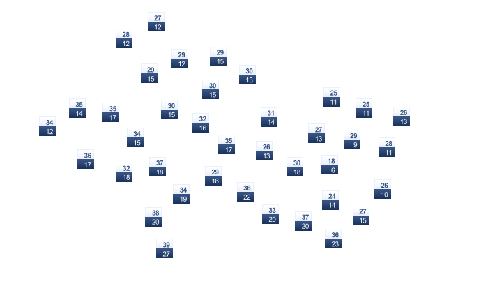 19 | 21 | 26 | 31 | 39 | 43 | 44 | 45 | 42 | 36 | 27 | 21 |