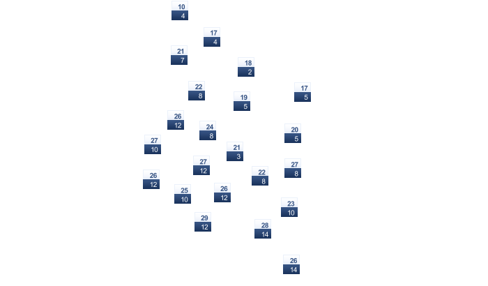 | 19 | 21 | 26 | 31 | 39 | 43 | 44 | 45 | 42 | 36 | 27 | 21 |