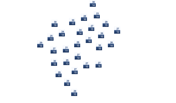 19 | 21 | 26 | 31 | 39 | 43 | 44 | 45 | 42 | 36 | 27 | 21 |