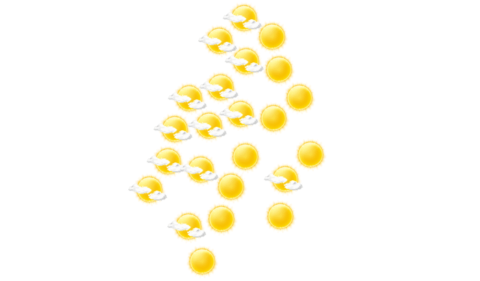 In al-Ghaida ist es morgens locker bewölkt bei Werten von 27°C. Im weiteren Tagesverlauf gibt es vom Nachmittag bis abends strahlenden Sonnenschein bei Werten von 28 bis zu 32°C. In der Nacht bedecken einzelne Wolken den Himmel und die Temperatur fällt auf 26°C.