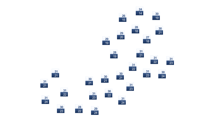 | 29 | 29 | 30 | 32 | 34 | 37 | 36 | 35 | 35 | 33 | 31 | 29 |