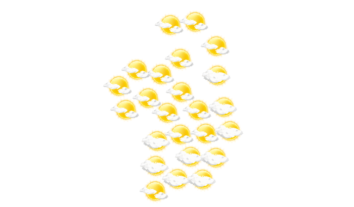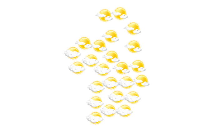 In Takeo ist es tagsüber bewölkt, die Sonne zeigt sich nur vereinzelt bei Temperaturen von 23 bis 34°C. Nachts bilden sich vereinzelt Wolken bei Werten von 24°C.