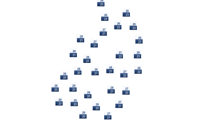 | 22 | 23 | 27 | 32 | 38 | 41 | 42 | 41 | 39 | 35 | 30 | 24 |