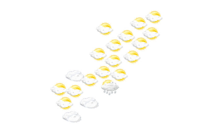 In Rivera wird am Morgen die Sonne von einzelnen Wolken verdeckt bei Werten von 21°C. Später ist es sonnig bei Höchsttemperaturen bis zu 28°C. Abends stören in Rivera nur einzelne Wolken den sonst blauen Himmel und die Temperaturen liegen zwischen 22 und 23 Grad. In der Nacht gibt es keine Wolken und die Sterne sind klar zu erkennen und die Temperatur fällt auf 20°C.