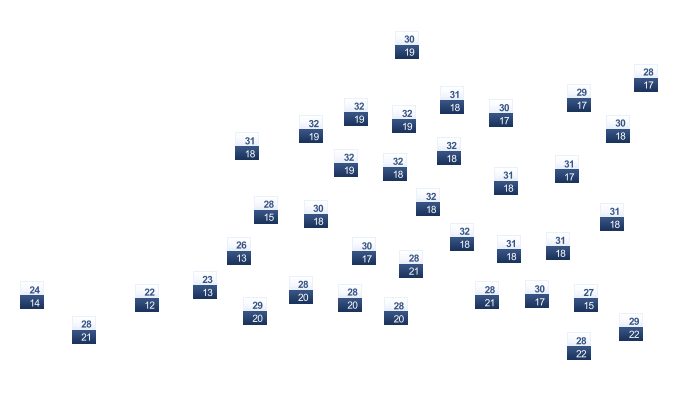 | 28 | 29 | 30 | 31 | 31 | 32 | 33 | 33 | 32 | 31 | 29 | 28 |
