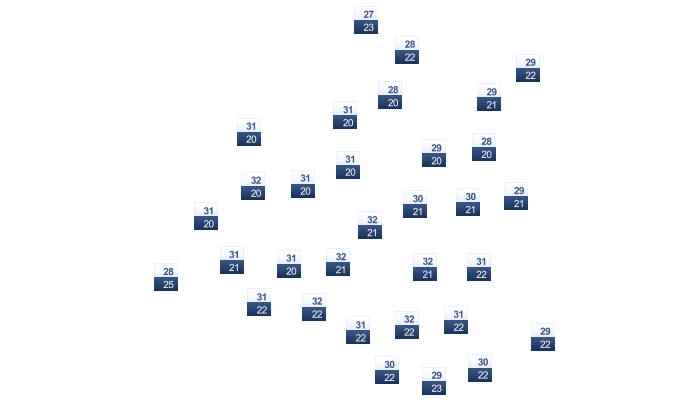 | 28 | 29 | 30 | 31 | 31 | 32 | 33 | 33 | 32 | 31 | 29 | 28 |