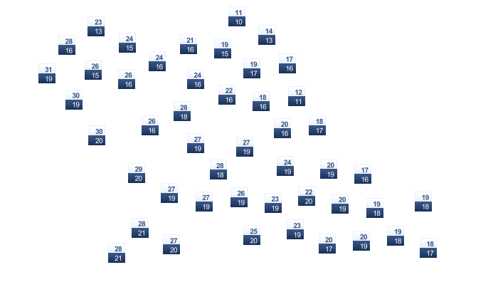 | 28 | 30 | 33 | 34 | 32 | 32 | 31 | 31 | 31 | 31 | 30 | 28 |