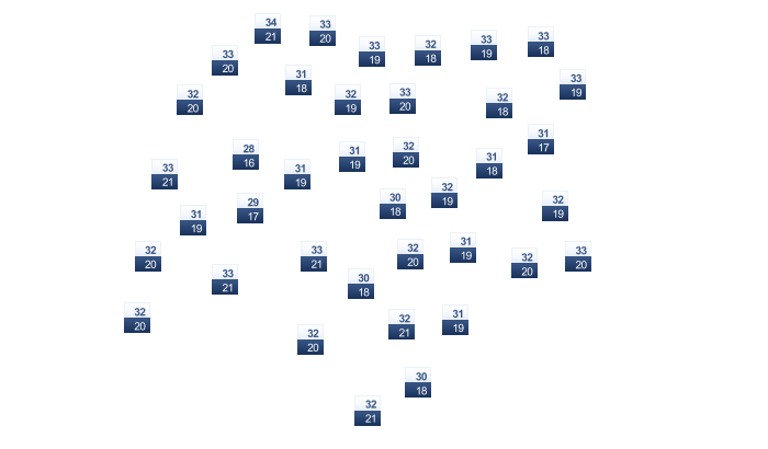 28 | 30 | 33 | 34 | 32 | 32 | 31 | 31 | 31 | 31 | 30 | 28 |